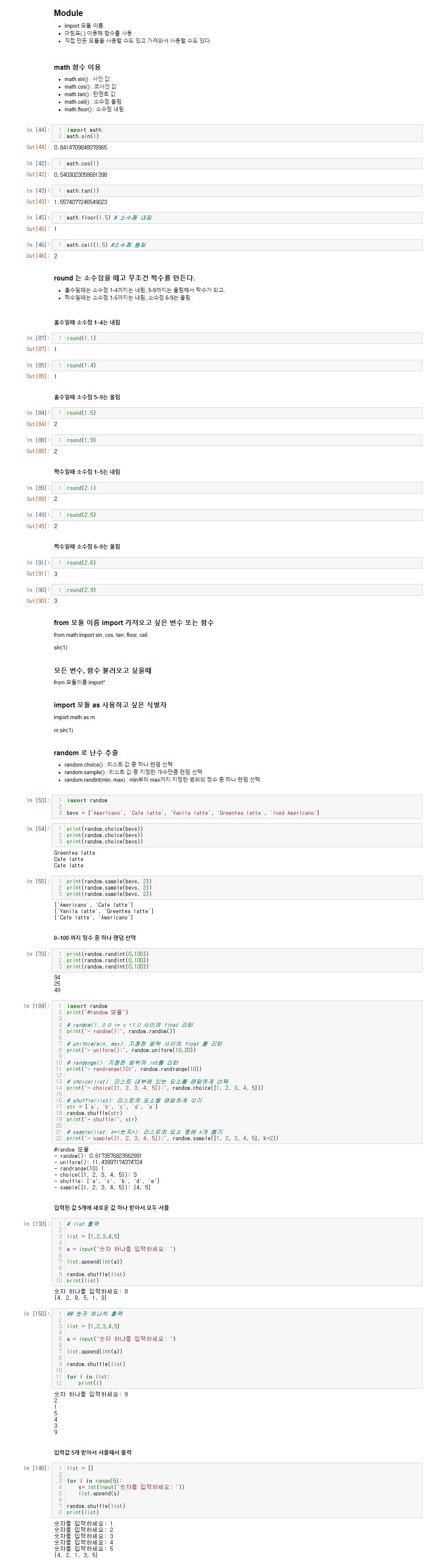 파이썬 - 모듈, math함수(sin, cos, tan, ceil, floor, round), random함수(choice, shuffle, randint), 숫자 입력받아 셔플 출력