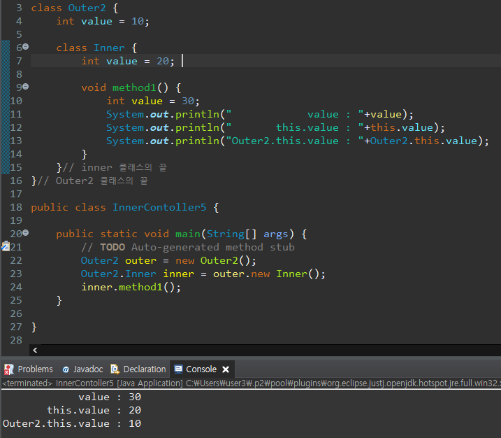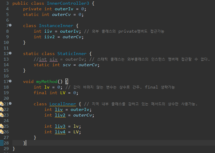 default(생략가능) , public 만 붙일 수 있는 외부 클래스와 달리, 내부 클래스에는 default(생략가능) , public, private, protected까지 가능하다.
