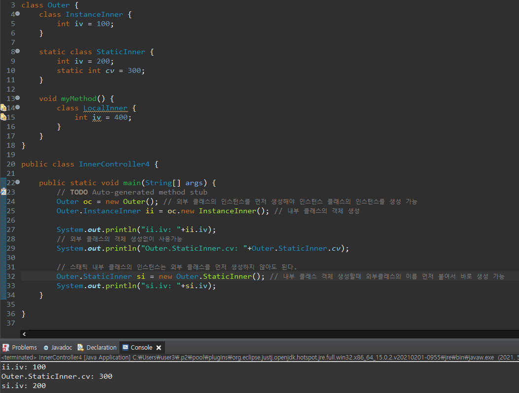 - static 내부 클래스 객체 생성할때, 외부 클래스의 객체 생성없이 외부클래스의 이름을 먼저 붙여서 바로 사용 가능하다.