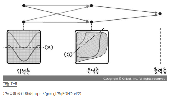 - 숨어있는 층, 즉 은닉층을 만들어 공간을 왜곡하면 두 영역을 가로지르는 직선을 그을 수 있다.