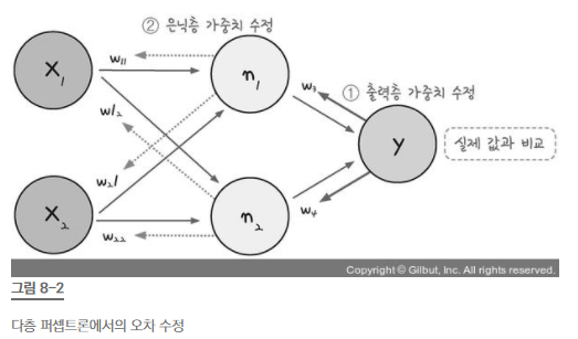 - 결과값의 오차를 구해 이를 토대로 하나 앞선 가중치를 차례로 거슬러 올라가며 조정한다. → 계산 방향이 출력층에서 시작하는데 이를 오차 역전파(back propagation)이라고 한다.