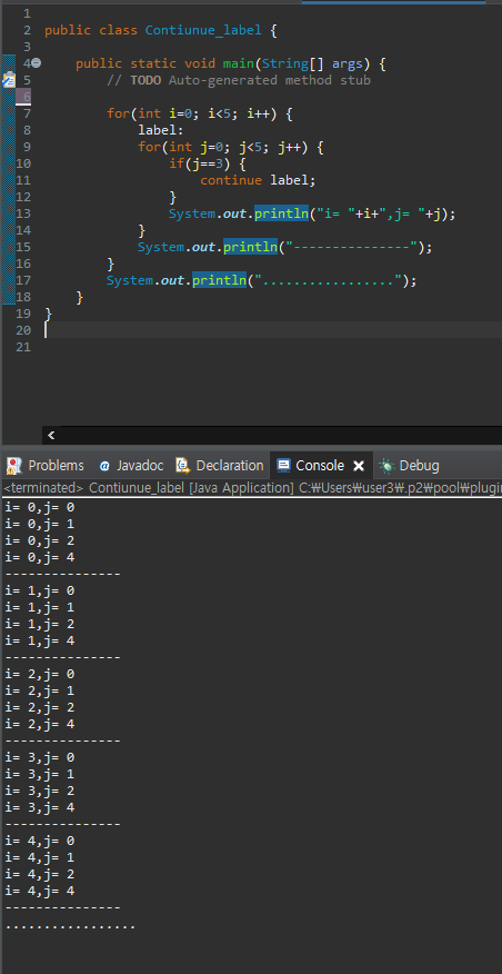위의 예제와 같이 label밖으로 돌지 않고 label 위치 바로 아래에 있는 조건식(증감식)으로 이동하므로 label위치 주의!!!