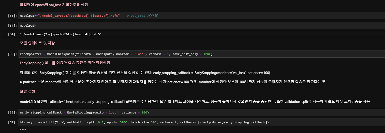 - EarlyStopping() : 학습이 진행되어도 테스트셋 오차가 줄지 않으면 학습을 멈추게 하는 함수