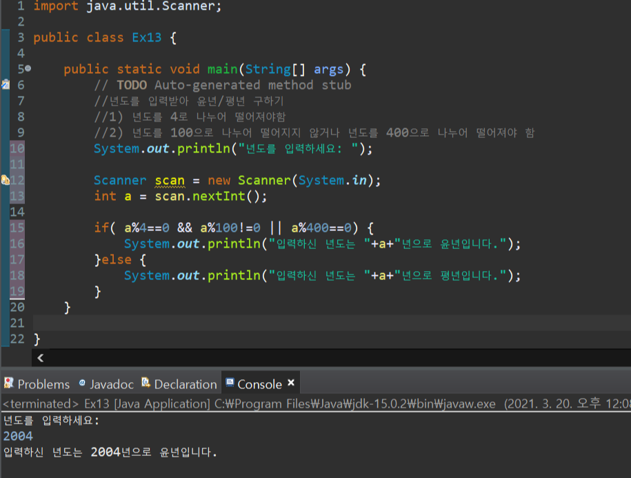 Java 연습문제(13) - 윤년, 평년 구하기 본문