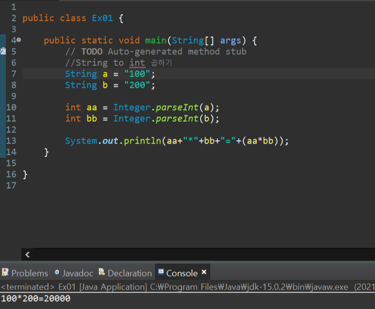 Java 연습문제(1) - 문자열 형변화하여 곱하기 본문