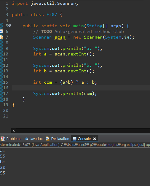 Java 연습문제(7) - 입력받은 두수중 더 큰수를 출력(삼항연산자 이용) 본문