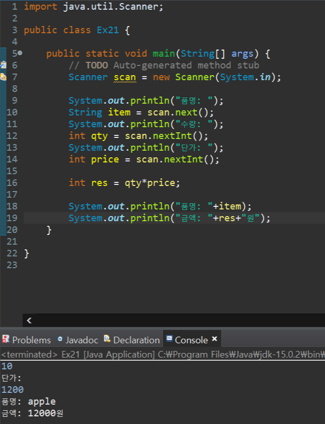 Java 연습문제(21) - 품명, 단가 수량 계산, 금액 구하기 본문